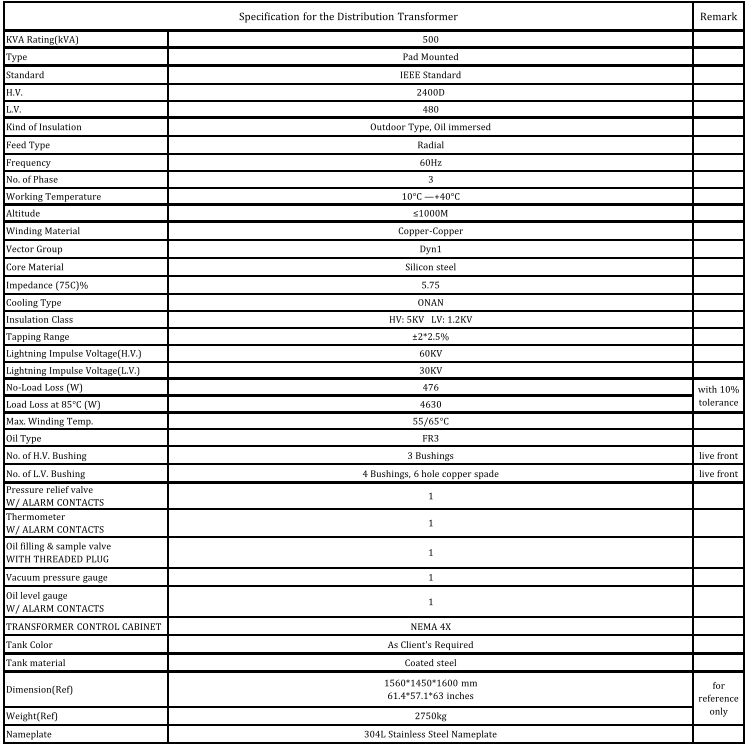 • NEMA 4X Pad Mounted Oil Filled Transformer 500 KVA, 3 PH, 60 Hz
