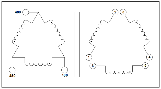 - Primary: 480 VAC L-L, 15.3 Amps, Closed Delta