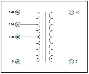 The schematic diagram is shown below. When input is 120 VAC, (X1 and X4) is selected. When input is 114 VAC, (X1 and X3) is selected. When input is 108 VAC, (X1 and X2) is selected.