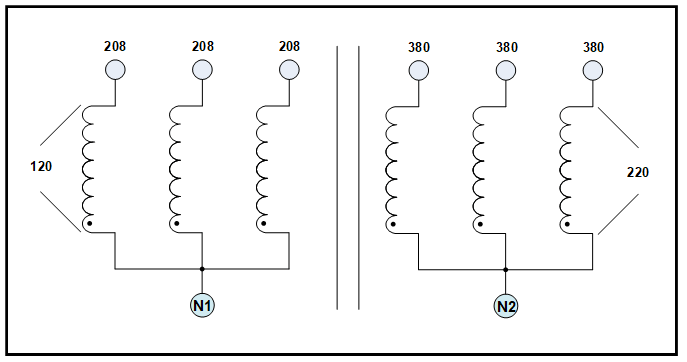 - Secondary: 380 VAC L-L, 22.7 Amps, 220 VAC L-N, Wye with a neutral N2