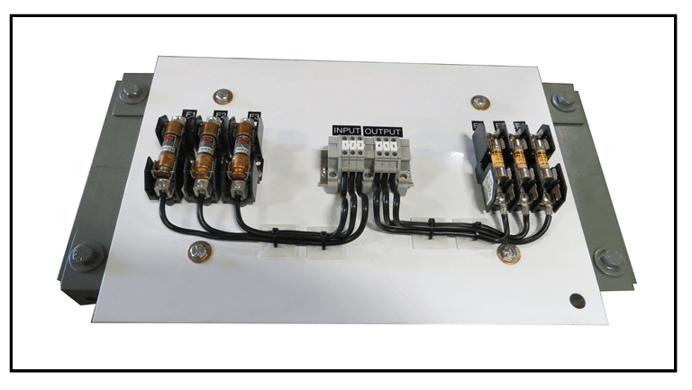 The fuses (F1 to F6) and the input/output terminal block are installed on a metal plate. The metal plate is placed on top of the transformer inside the enclosure.